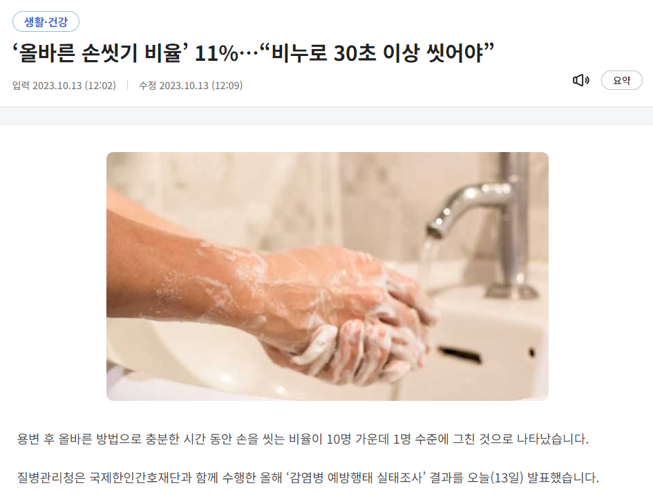 매일경제: “몇 초 씻어야 하나”…용변 후 제대로 손 씻기 10명 중 1명