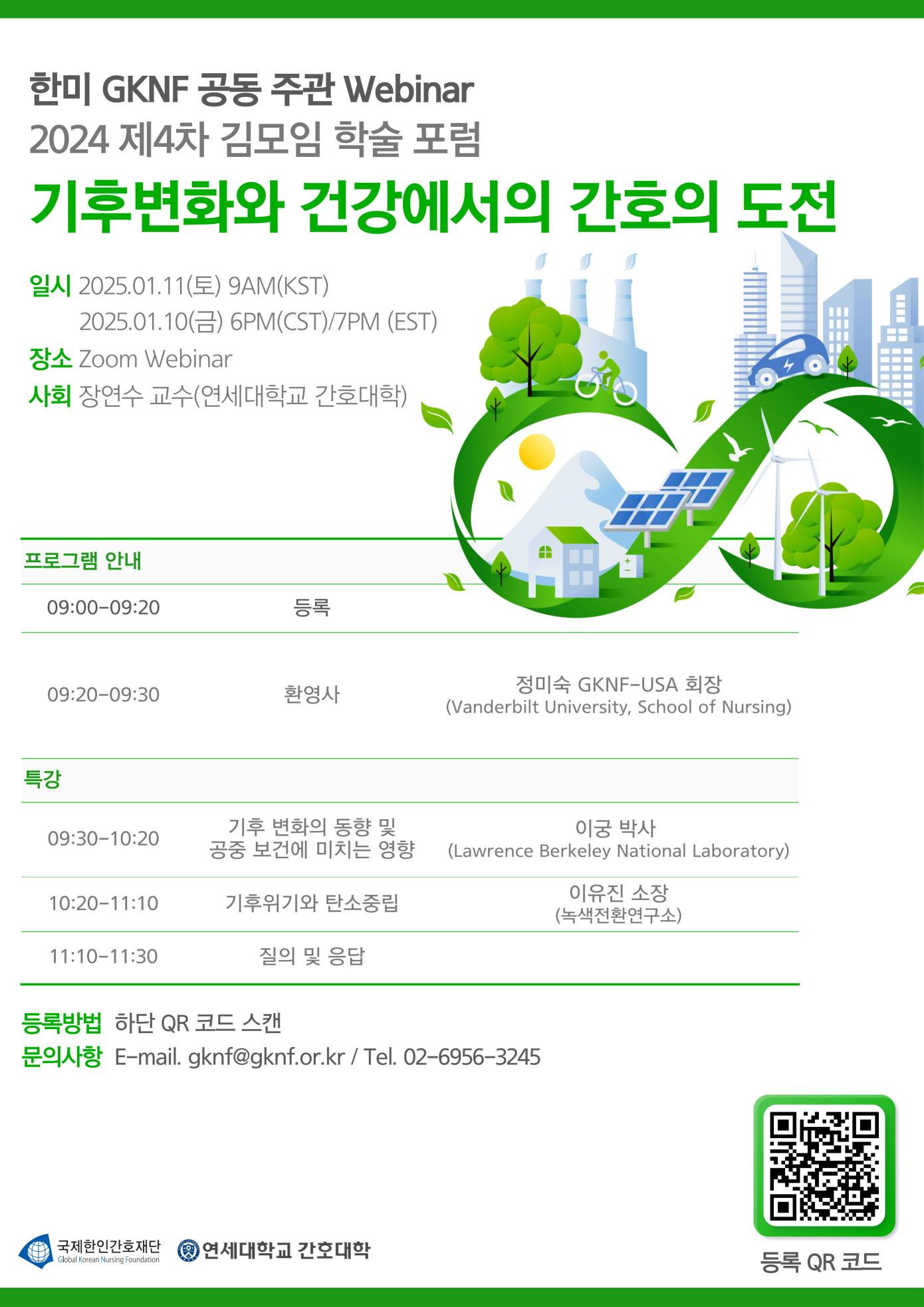 국제한인간호재단(이사장 이태화)은 2025년 1월 11일(토) 오전 9시부터 11시 30분까지 ‘기후변화와 건강에서의 간호의 도전’을 주제로 제4차 김모임 학술 포럼을 개최했다. 이번 포럼은 한·미 GKNF 공동 주관으로 진행되었으며, 기후 변화가 건강과 간호에 미치는 영향을 조망하고 간호 분야의 역할과 협력 방안을 모색하는 자리로 마련되엇다.
