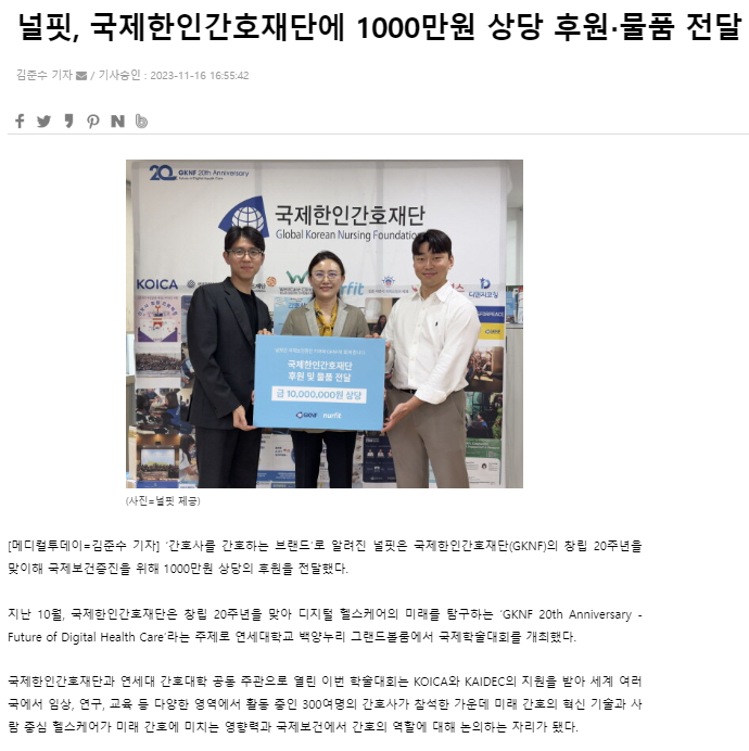 메디컬투데이: 널핏, 국제한인간호재단에 1000만원 상당 후원·물품 전달