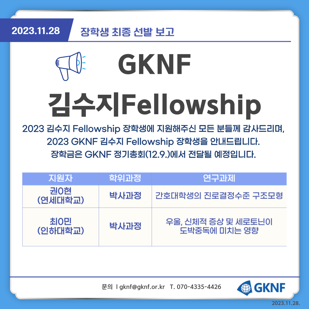 2023 GKNF 김수지 Fellowship 장학생에 지원해주신 모든 분들께 진심으로 감사드리며,